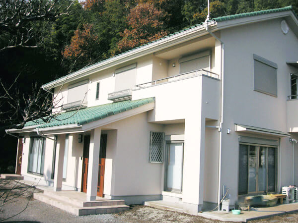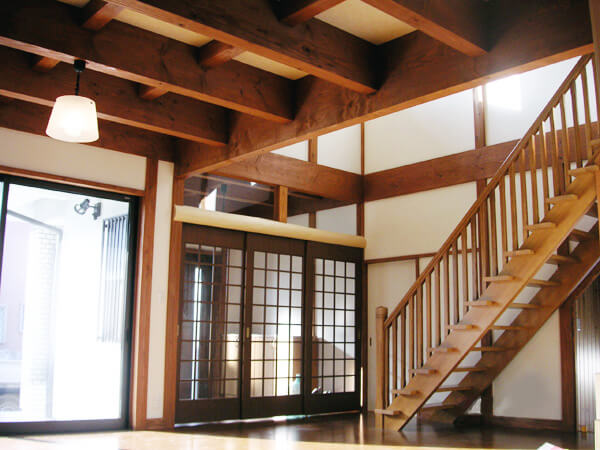 落ち着いた和室で来客をお迎えしたい。と言うお客様のご要望にお答えして、山小屋風の丸太の梁を豪快に使用た、ゆったりとしたくつろぎのスペースを実現した和風住宅です。外観は純和風の入母屋屋根です。外壁はサイディング落ち着いた雰囲気になったと思います。